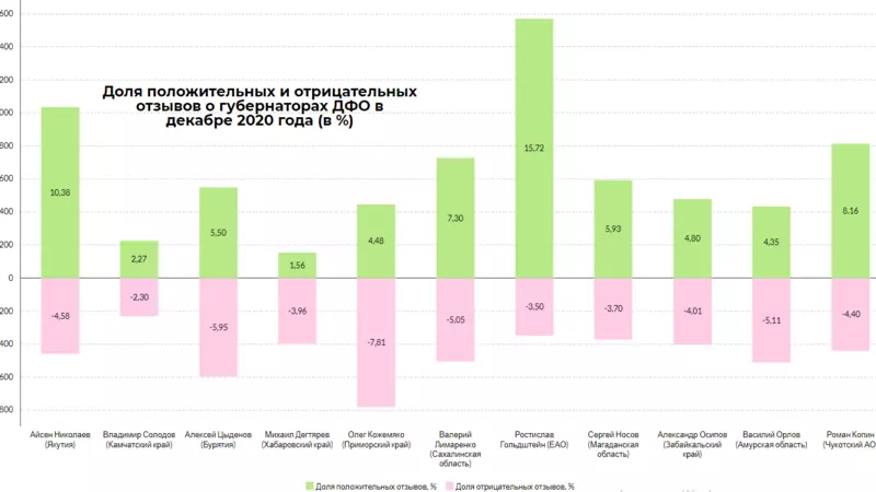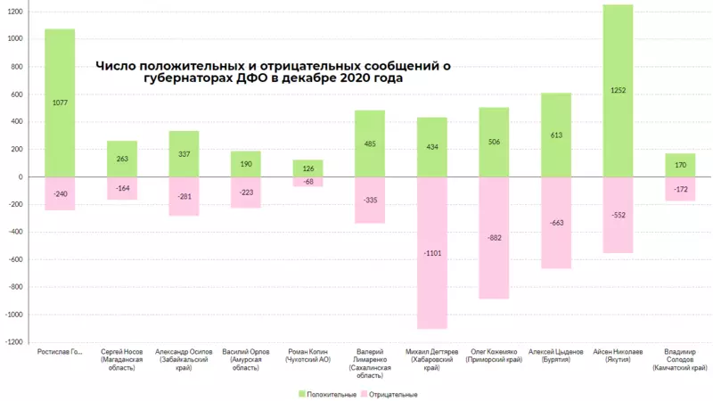 По числу позитивных и негативных сообщений о своей работе Валерий Лимаренко также вошел в топ-5 на Дальнем Востоке. Он занял пятое место среди коллег по количеству похвал — сахалинского губернатора оценили положительно в 485 сообщениях по итогам декабря. Еще 335 публикаций содержали критику, и это также пятая строчка в ДФО. Самым обруганным по этому показателю стал врио главы Хабаровского края Михаил Дегтярев, меньше всего критики получил губернатор Чукотки Роман Копин. Больше других пользователи захваливали руководителя Якутии Айсена Николаева, а самым «бедным» по числу комплиментов также стал глава Чукотки.
