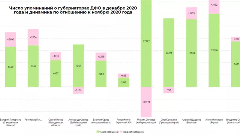 Кроме того, Валерий Лимаренко вошел в топ-3 дальневосточных губернаторов, о которых в декабре граждане стали писать чаще. В сравнении с ноябрьским показателем, число публикаций о сахалинском губернаторе выросло на 2 400 — больше только у якутского главы Айсена Николаева (+ 3 482) и руководителя ЕАО Ростислава Гольдштейна (+ 2 656). О трех политиках ДФО россияне и вовсе стали упоминать реже, чем в декабре. Абсолютным антилидером по популярности стал Михаил Дегтярев: врио губернатора Хабаровского края за месяц «потерял» 38 974 сообщения. Также просели показатели у Александра Осипова (Забайкальский край) и Олега Кожемяко (Приморье).