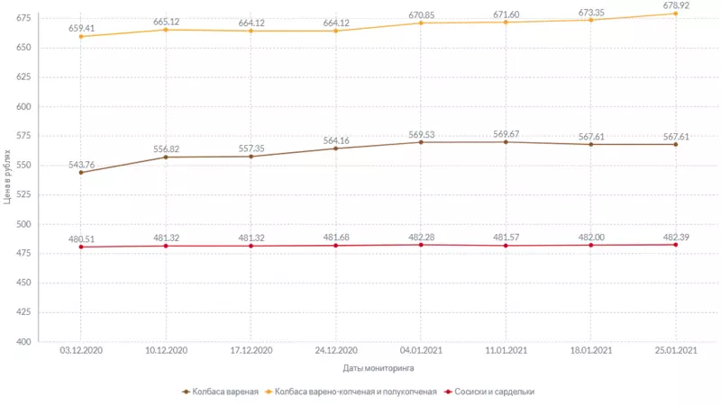 На рынке мясных деликатесов незначительно подорожали сосиски и сардельки — разница в сравнении с прошлой неделей составила 39 копеек. Полукопченая и варено-копченая колбаса выросла в цене на 5 рублей и 47 копеек, а стоимость вареной не изменилась и составляет в среднем 567 рублей и 61 копейку за килограмм.