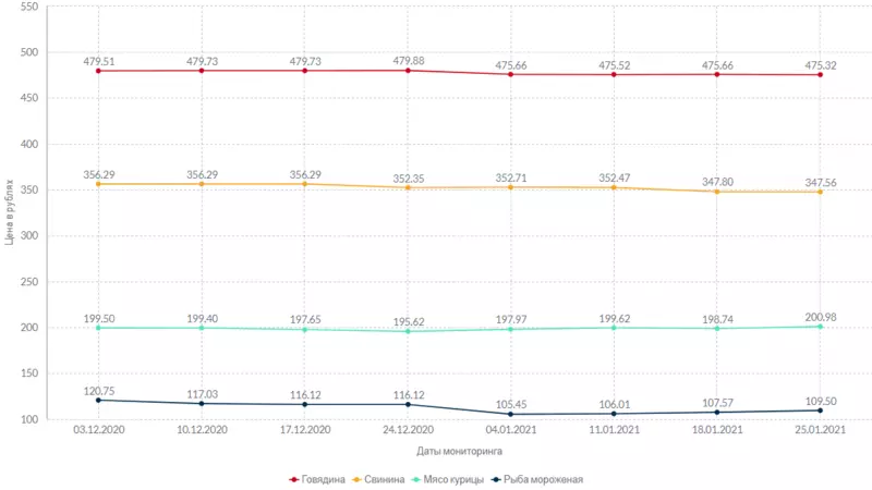 Говядина за прошедшую неделю подешевела на 34 копейки. Стоимость свинины также немного снизилась — разница с предыдущим отчетным периодом составила 24 копейки. А вот куриное мясо, наоборот, подорожало сразу на 2 рубля и 24 копейки за семь дней. Выросла и средняя цена килограмма мороженой неразделанной рыбы — прибавка составила 1 рубль и 93 копейки.
