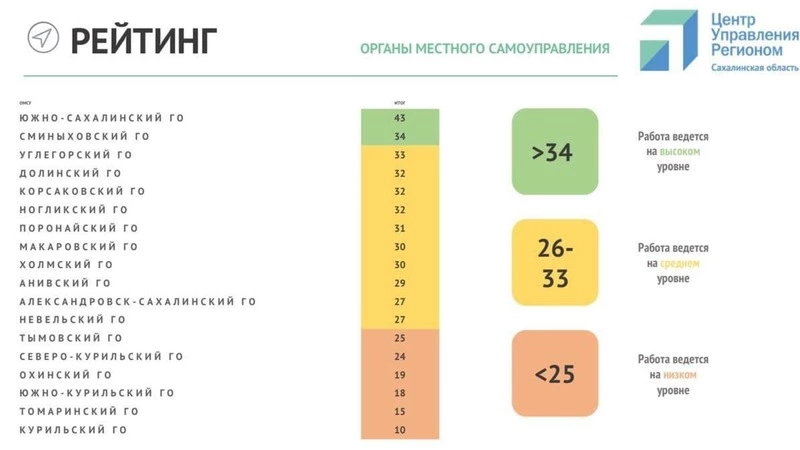 На среднем уровне работают власти Углегорского (33), Долинского (32), Корсаковского (32), Ногликского (31), Поронайского (31), Макаровского (30), Холмского (30), Анивского (29), Александровск-Сахалинского (27) и Невельского (27) городских округов.