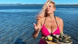Девушка в ярком бикини похвасталась крупным уловом устриц на озере Буссе