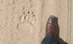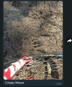 В какой-то момент автомобиль поравнялся с косолапым малышом, и водителю удалось снять его очень близко. Накануне медвежью семью видели на дороге в Томаринском районе. А недалеко от коровников в Заречном обнаружили огромные следы хозяина леса.