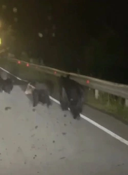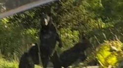 Медведица с тремя медвежатами вышла на автотрассу на Сахалине. ВИДЕО