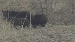 Косолапых сняли на видео с довольно близкого расстояния. Медведица и три ее малыша искали пищу пока еще в жухлой траве и не обращали особого внимания на оператора. Они не убежали, даже когда мужчина попытался прогнать зверей гудком автомобиля.